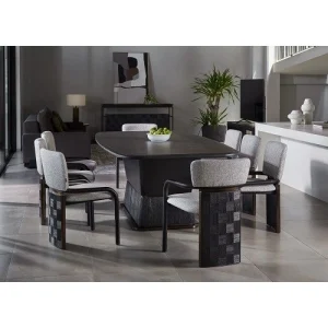 A combination of high-quality Sungkai wood and veneer, finished with an open pore black NC finish (SW-SBK/VN-SBK). The table’s sunburst-pattern veneer brings a beautiful blend of heritage design with a contemporary edge. Solid wood edging ensures both durability and refinement.